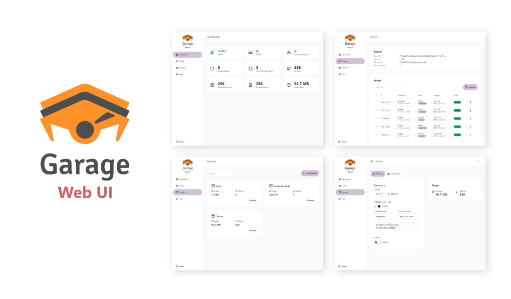 Garage WebUI — це простий веб-інтерфейс адміністратора для Garage, самостійно розгортуваного, S3-сумісного розподіленого сервісу об’єктного сховища. Цей інструмент надає зручний графічний інтерфейс для управління кластером Garage, бакетами (buckets), ключами доступу та об’єктами.