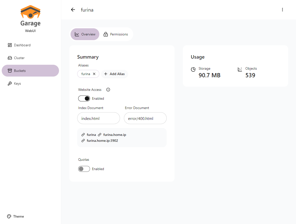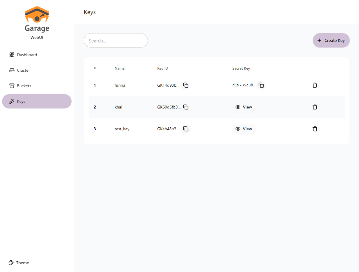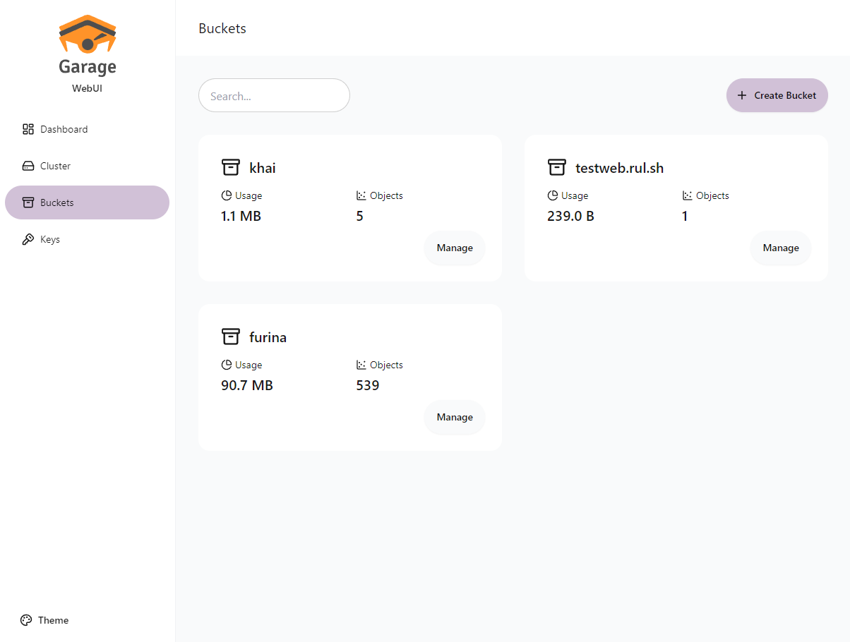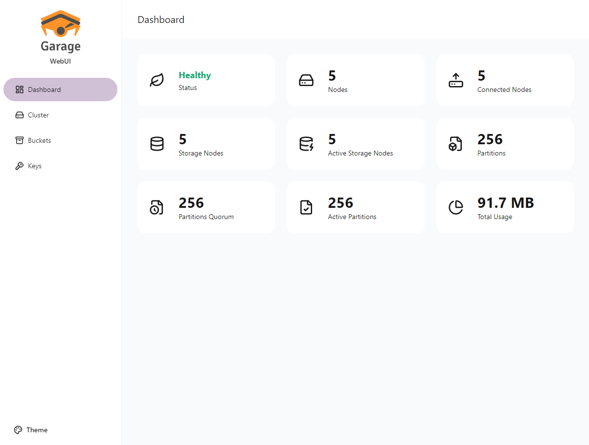 Garage WebUI — це простий веб-інтерфейс адміністратора для Garage, самостійно розгортуваного, S3-сумісного розподіленого сервісу об’єктного сховища. Цей інструмент надає зручний графічний інтерфейс для управління кластером Garage, бакетами (buckets), ключами доступу та об’єктами.